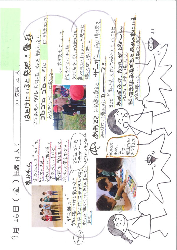 8月にもりっこまつりを行いました。 あいにくのお天気で室内での開催になりましたが、 オープニングのすみれ組のたいこから盛り上がっていました。 みんなで作ったお祭り。 縁日にゲームに宝探しにポップコーン等、お父さんお母さんとお店を回り楽しみました。 最後の盆踊りは雨もやみ、園庭で行うことができました。 東鷹栖太鼓愛好会の方々も来ていただき、生のたいこに合わせて盆踊り。 楽しい夏の思い出ができました。 | ||